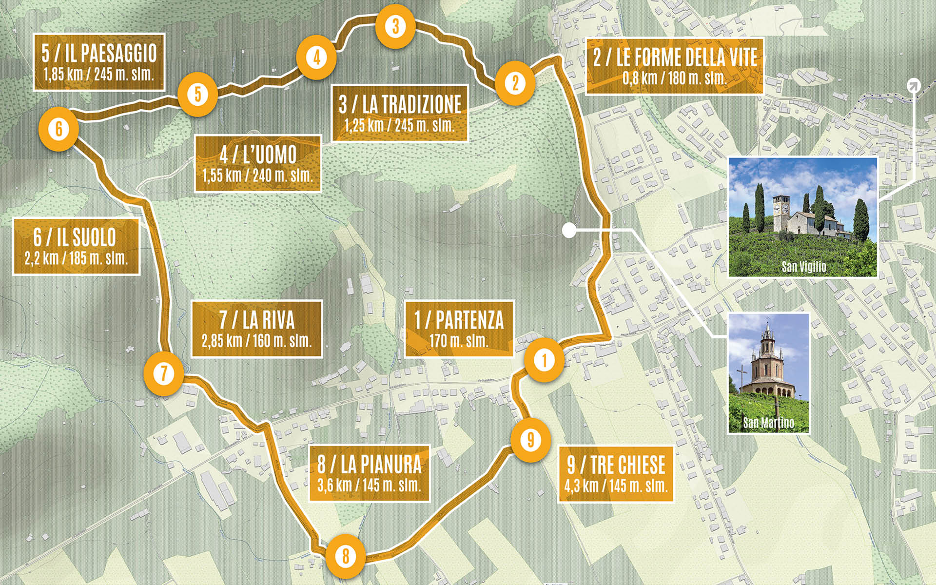 TRE CHIESE Di fronte a noi tre chiese: San Martino, San Vigilio e il campanile della chiesa parrocchiale della frazione di Col San Martino. In mezzo un agglomerato di vecchie case dove spicca la villa Paccanoni (erano i “Signori” del paese) con le sue pertinenze (stalla, fienile, cantina, granaio, etc). Il percorso è finito, avete attraversato e ammirato uno dei più bei luoghi del comprensorio Prosecco Superiore DOCG, avete compreso il vero significato di terroir e acquisito familiarità con i fattori che lo compongono, dove la vera regia è data dal susseguirsi delle stagioni e dalla mano del viticoltore che con sapienza fa risplendere la natura.